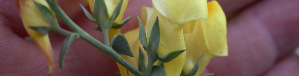 A creeping perennial reaching 2–4 feet tall. Blue-green, waxy leaves clasp the stem. Produces yellow snapdragon-like flowers with white highlights from late spring through summer. Seeds develop in two-celled berry-like capsules.