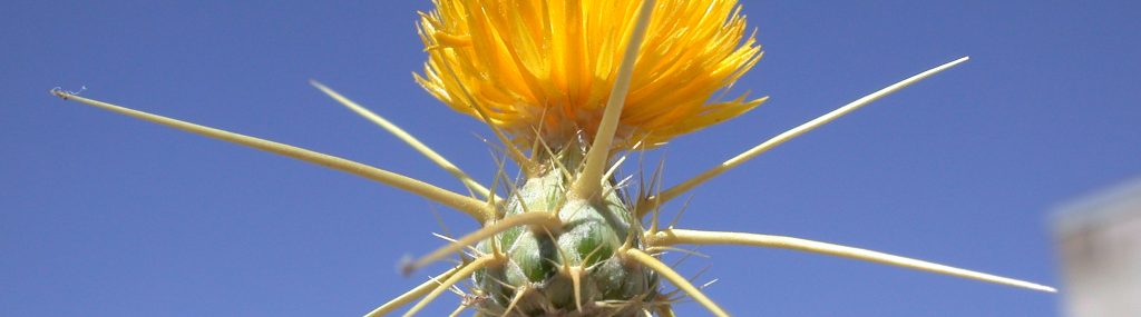 A 2–3 ft winter annual with blue-green foliage and distinctive cream-colored thorns (¼–¾ inch long) protruding from yellow flower heads. Rosette leaves resemble dandelion. Blooms in early summer.